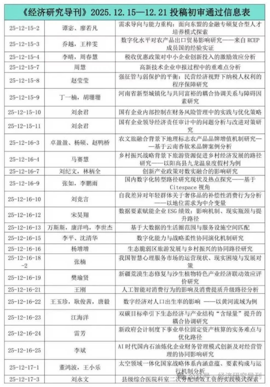 《经济研究导刊》2025.12.15-12.21投稿稿件初审通过信息表